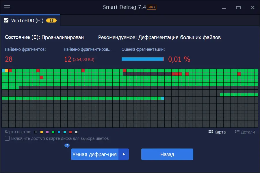- Автоматически распознаёт и исключает SSD из процесса дефрагментации, продлевая их срок службы