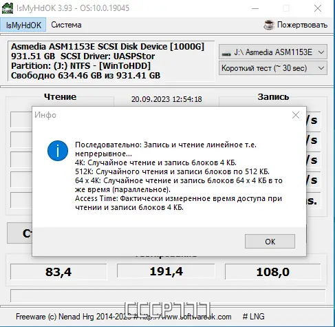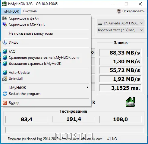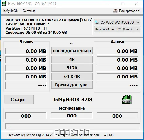IsMyHdOK — это компактная утилита для тестирования производительности жестких дисков и твердотельных накопителей. Программа позволяет быстро оценить скорость чтения и записи данных на HDD, SSD и USB-устройствах. Благодаря минимальным требованиям к системе и портативной архитектуре, она подходит для диагностики накопителей на любом компьютере без установки.