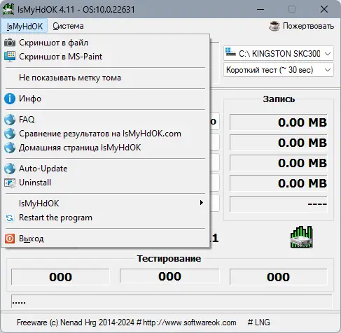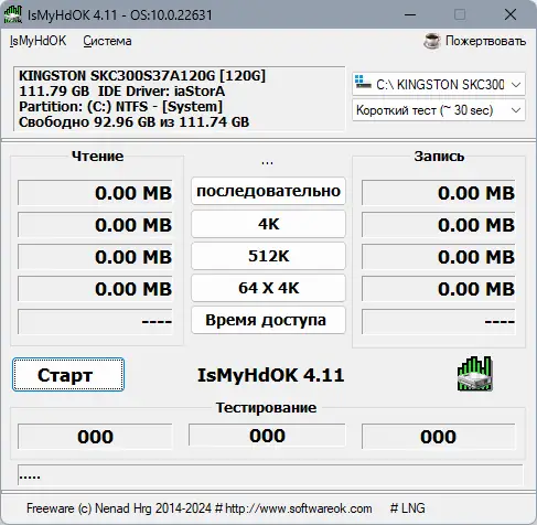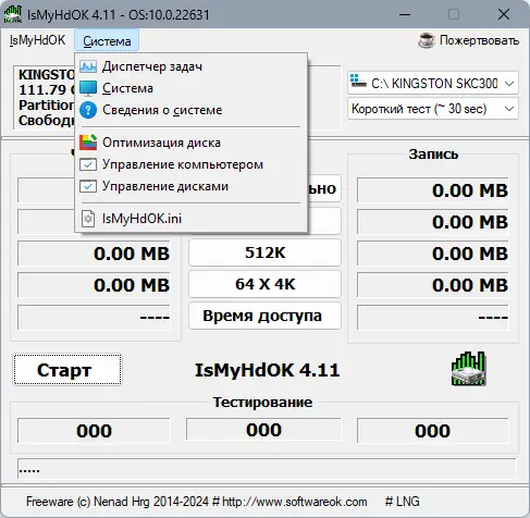 IsMyHdOK — компактная утилита для тестирования производительности жестких дисков и твердотельных накопителей, работающая без установки и не нагружающая систему. Программа позволяет быстро оценить скорость чтения и записи данных на HDD, SSD и USB-устройствах. Поддерживает несколько режимов проверки, от краткосрочных до длительных тестов, и автоматически делает скриншот результатов.