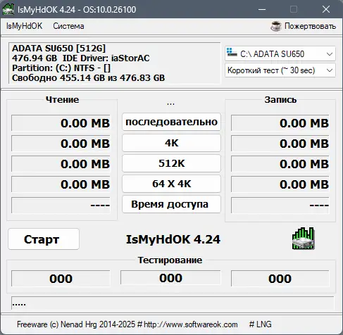 IsMyHdOK — это минималистичная утилита, разработанная для диагностики дисковых накопителей. Она не требует сложной настройки и предоставляет пользователю информацию о скорости работы запоминающих устройств. Программа поддерживает различные типы накопителей, включая традиционные жесткие диски, современные SSD и внешние USB-диски.