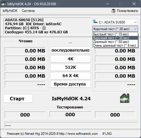 IsMyHdOK — легкая и эффективная утилита для тестирования производительности жестких дисков и твердотельных накопителей. Программа позволяет быстро оценить скорость чтения и записи данных на HDD, SSD и USB-накопителях. Благодаря компактному размеру и отсутствию необходимости в установке, она подходит для использования на любом компьютере.