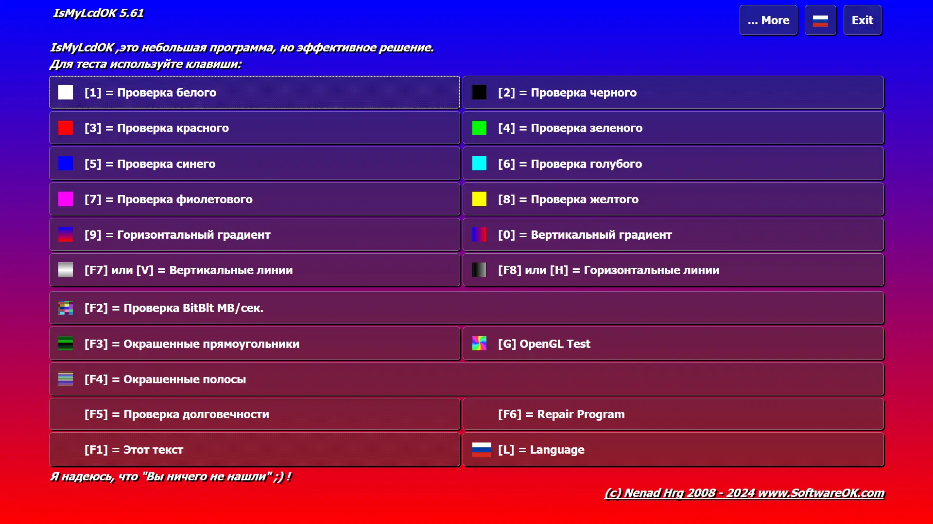 IsMyLcdOK — это легковесное приложение, разработанное для диагностики жидкокристаллических экранов. Оно помогает выявить дефекты матрицы, которые могут не проявляться в обычном режиме работы. С помощью последовательного отображения однотонных экранов в различных цветах — белом, чёрном, красном, зелёном, синем и других — программа создаёт оптимальные условия для визуального обнаружения неисправных пикселей.