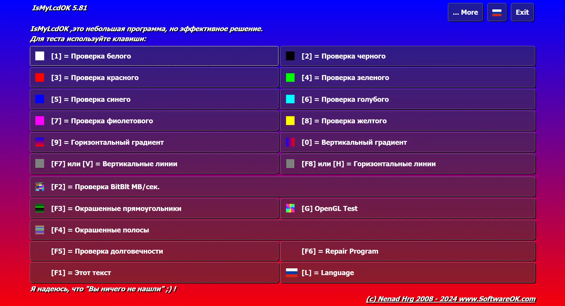- Программа помогает определить наличие мёртвых пикселей, которые не реагируют на смену изображения
