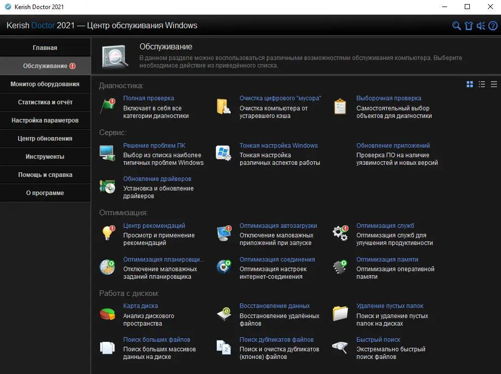 Kerish Doctor — это современная утилита для комплексной оптимизации и автоматического обслуживания операционной системы Windows. Программа сочетает в себе функции профилактики сбоев, очистки системы, обновления программ и повышения производительности. Благодаря интеллектуальным алгоритмам, она подходит как для новичков, так и для опытных пользователей, стремящихся поддерживать компьютер в идеальном состоянии.