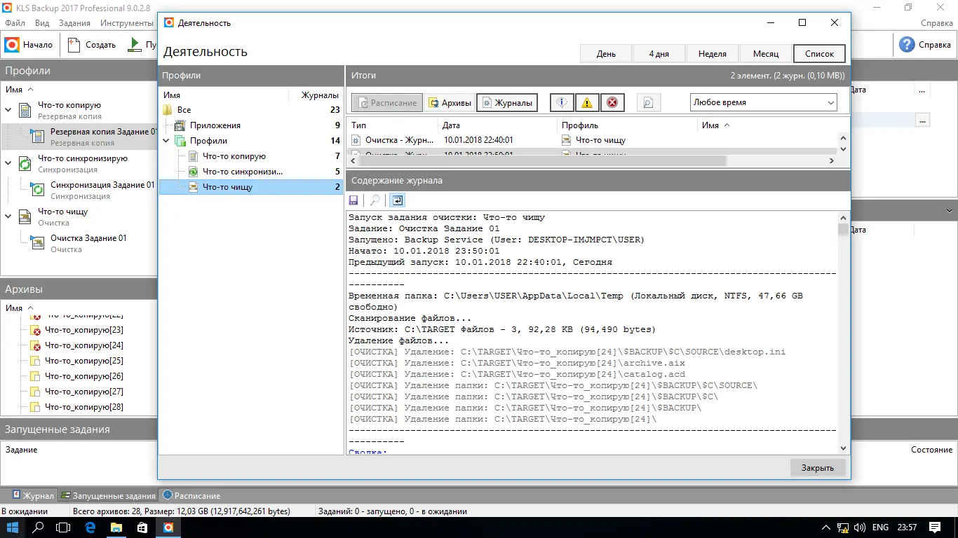 Для начала работы в KLS Backup необходимо создать профиль резервного копирования, указав исходные данные — папки, реестр, базы данных или настройки приложений. Затем выбирается место назначения: локальный диск, съёмный носитель, сетевая папка, FTP-сервер или облачное хранилище. Программа поддерживает работу с открытыми файлами и сохраняет NTFS-разрешения, что особенно важно при копировании системных данных. Далее задаются параметры сжатия и шифрования, после чего можно запустить процесс вручную или назначить его выполнение по расписанию через встроенный планировщик. Через консольный интерфейс возможна интеграция в автоматизированные сценарии обслуживания.