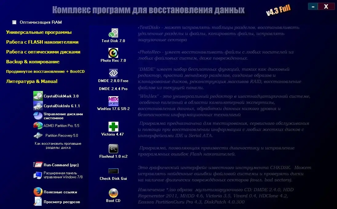 Сборник объединяет профессиональные и бесплатные утилиты, что делает его универсальным решением для разных сценариев восстановления. Программы охватывают все этапы — от первичной диагностики до финального извлечения файлов. Многие инструменты работают напрямую с секторами диска, что позволяет восстанавливать данные даже приных повреждениях файловой системы. Портативность решает проблему зависимости от операционной системы и позволяет использовать утилиты с USB-носителя.