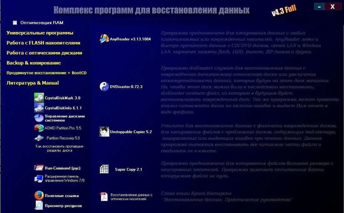 Комплекс программ для восстановления данных — это мощный сборник утилит, предназначенный для возвращения утерянной информации с различных типов носителей. Включает 57 портативных инструментов для диагностики, резервного копирования и восстановления данных с жёстких дисков, флешек, карт памяти и оптических дисков. Незаменим при сбоях файловой системы, вирусных атаках, случайном форматировании или повреждении разделов.