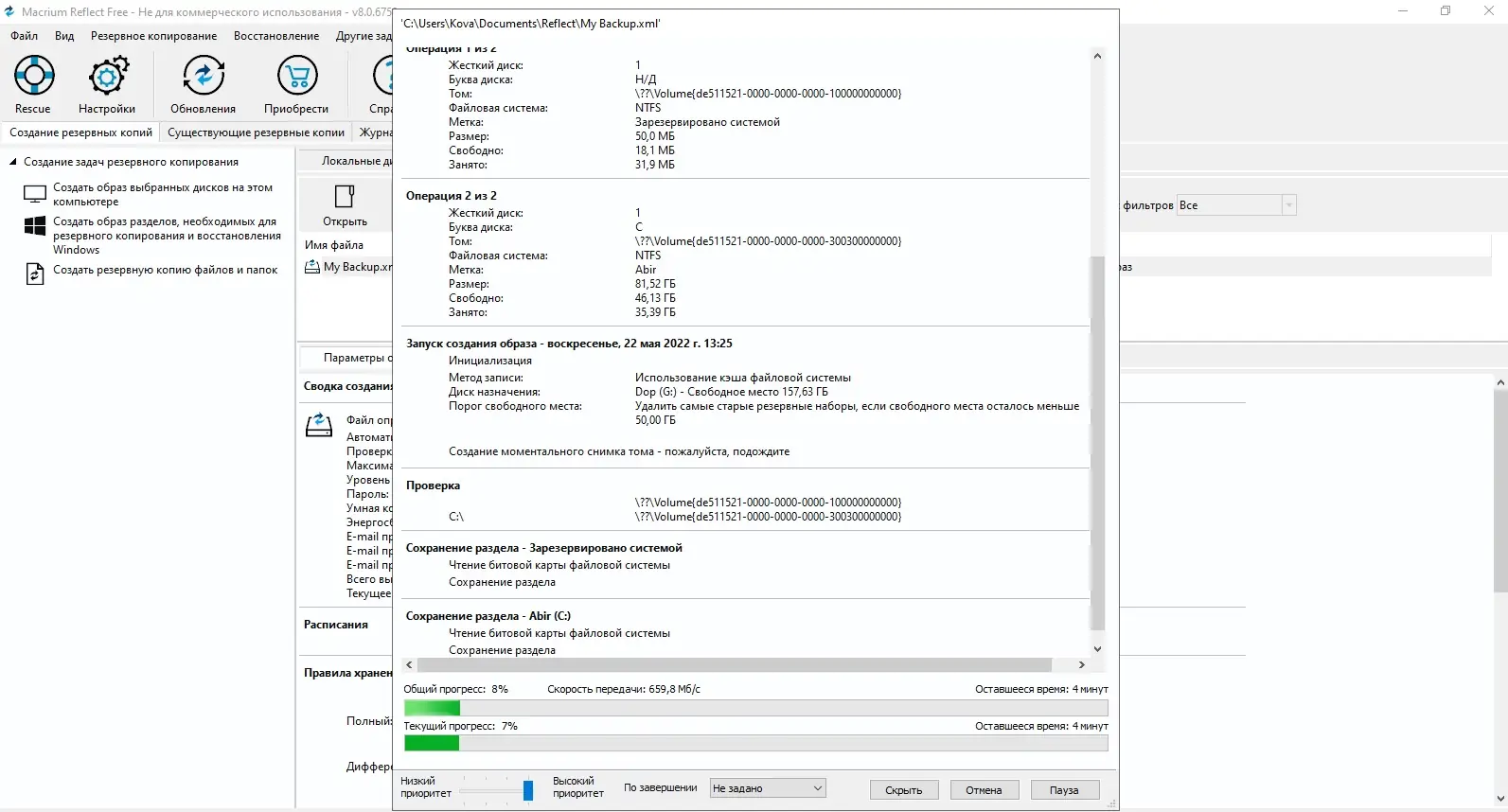 Интерфейс Macrium Reflect выполнен в виде наглядной панели, где каждый диск и раздел отображаются в виде диаграммы. Пользователю достаточно выбрать нужный раздел, назначить тип резервного копирования — полное, инкрементное или дифференциальное — и указать место сохранения образа. Для автоматизации процесса используется встроенный планировщик, который поддерживает выполнение задач при запуске системы, в определённое время или при подключении внешнего носителя. Также доступна команда командной строки MRAuto.exe, позволяющая запускать резервирование в фоновом режиме без участия пользователя.