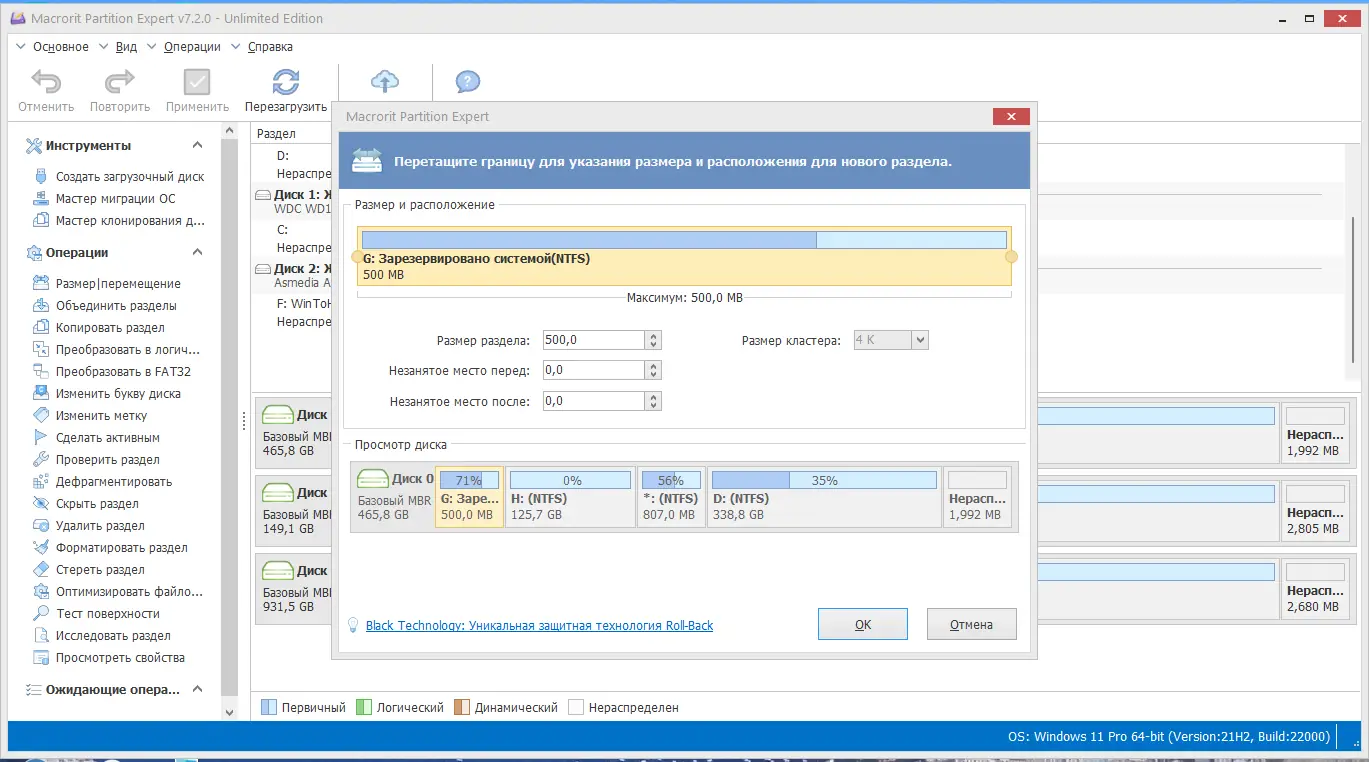 Интерфейс программы интуитивно понятен и организован в виде графического представления всех дисков и разделов. Пользователь может изменять размеры разделов, перетаскивая границы мышью, или задавать параметры вручную. Каждая операция добавляется в очередь, что позволяет проверить план изменений перед применением. Поддержка русского языка делает навигацию доступной даже для новичков, а функция отмены команд позволяет избежать ошибок.