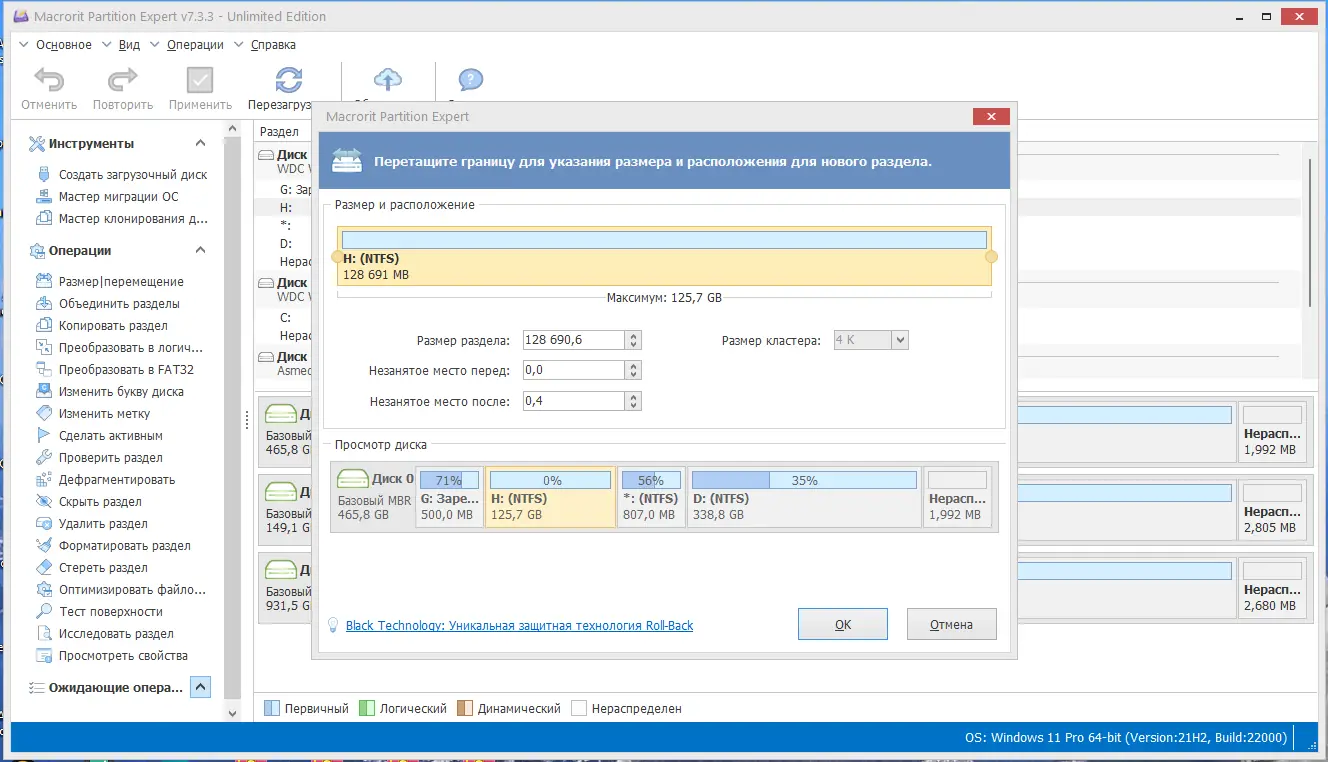 Интерфейс программы интуитивно понятен и не требует глубоких знаний в области работы с дисками. После запуска отображается визуальная карта всех подключённых накопителей, где можно видеть распределение разделов, их размеры и свободное место. Для изменения размера раздела достаточно выделить его, выбрать соответствующую команду и указать новые параметры. Все действия можно отменить до их применения, что снижает риск ошибок. Поддержка drag-and-drop упрощает перемещение разделов, а предварительный просмотр изменений помогает избежать нежелательных последствий.
