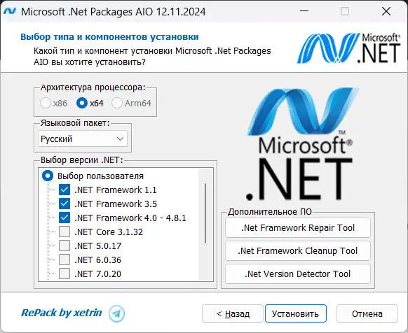 - Добавлены вспомогательные утилиты: .NET Framework Repair Tool, Cleanup Tool и Version Detector для диагностики и исправления ошибок.