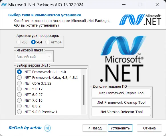- Полный набор версий .NET Framework и .NET в одном установочном пакете