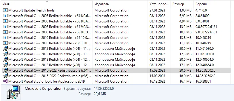 - Включает версии Visual C++ начиная с 2005 года по 2022 год