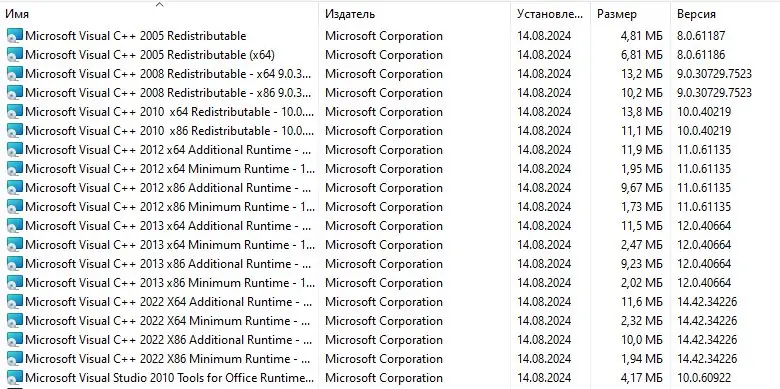 Microsoft Visual C++ Runtimes — это набор распространяемых компонентов, необходимых для запуска приложений, разработанных с использованием Visual Studio. Они включают в себя библиотеки среды выполнения, такие как CRT, стандартная библиотека C++, MFC и OpenMP. Без этих модулей многие программы не смогут корректно функционировать на компьютере.