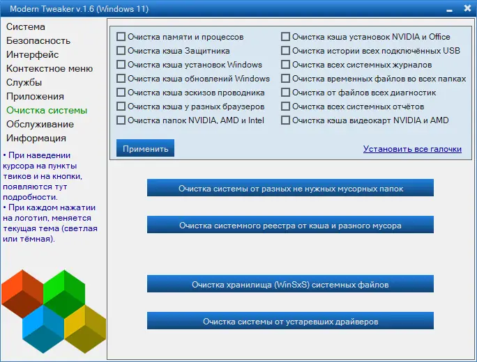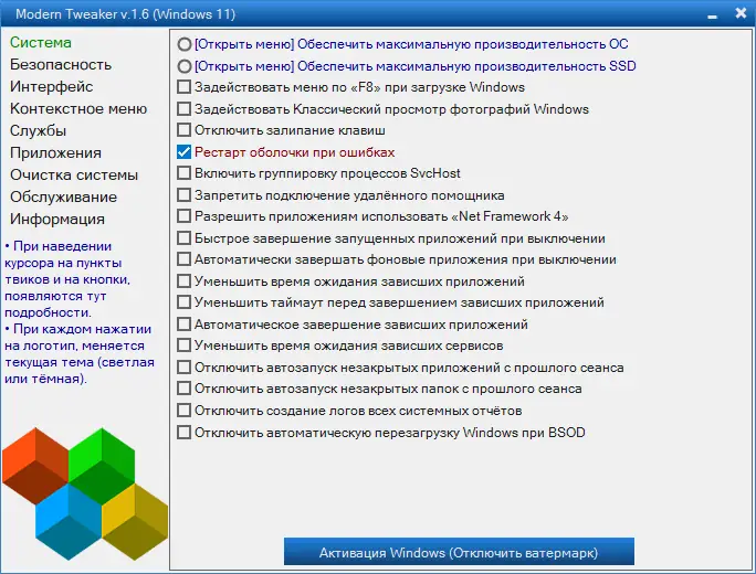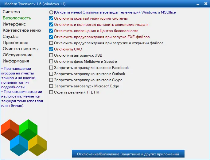 Modern Tweaker — это программная оболочка для тонкой настройки операционной системы Windows, позволяющая повысить производительность компьютера без глубоких технических знаний. Интерфейс утилиты интуитивно понятен, а твики сгруппированы по категориям, что упрощает процесс оптимизации. С её помощью можно быстро изменить параметры системы, интерфейса, безопасности и фоновых процессов.