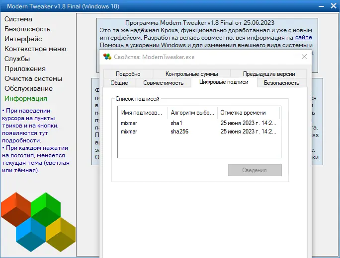 Версия 2.0 final программы Modern Tweaker доступна в портативном формате и совместима с Windows 7, 8.1, 10 и 11. Обновление до версии 2.1 включает исправления ошибок и улучшения в логике выполнения фоновых операций. Для корректной работы после изменения пути или имени файла требуется повторно применить пункты контекстного меню. Программа не имеет официального сайта, распространяется через доверенные каналы. Что это за программа — становится понятно уже при первом запуске: это мощный, но безопасный инструмент для настройки Windows. Её можно скачать для тестирования и постоянного использования.