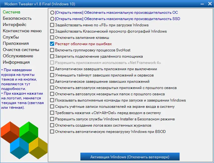 - Простой и понятный интерфейс с группировкой твиков по категориям