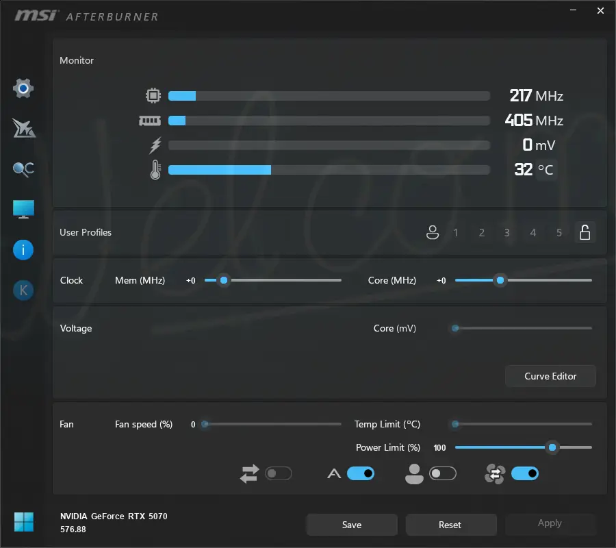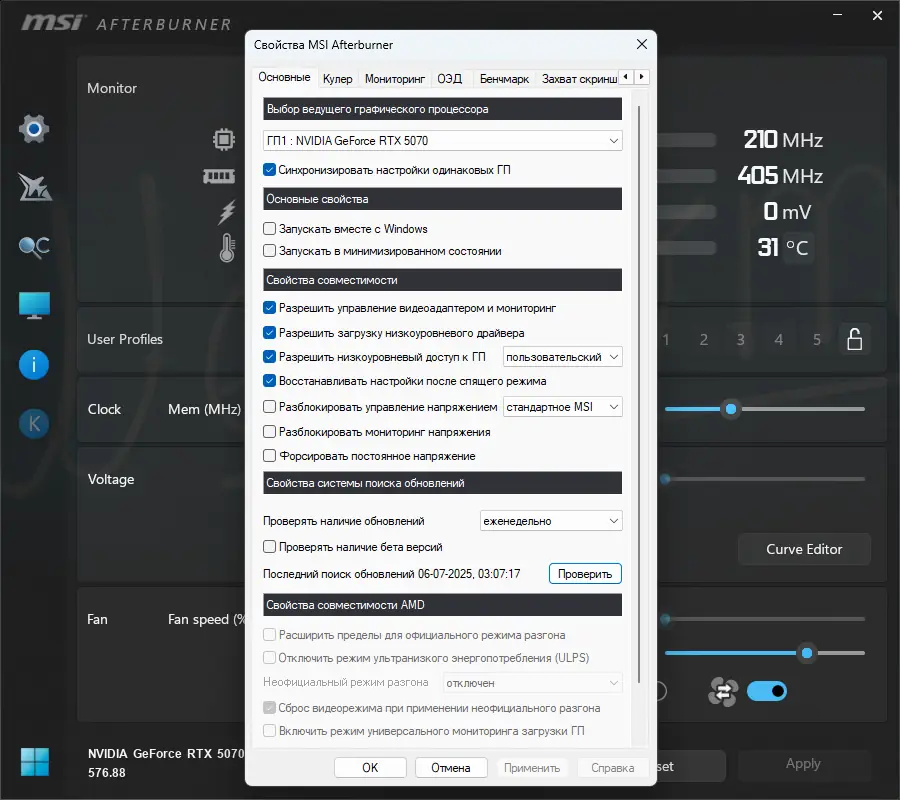 MSI Afterburner — мощная утилита для разгона и мониторинга видеокарт, совместимая с GPU любых производителей. Программа позволяет точно настраивать частоты ядра, памяти и шейдеров, управлять напряжением и скоростью вращения вентиляторов. Встроенная система оверлея отображает ключевые параметры в реальном времени прямо во время игры.