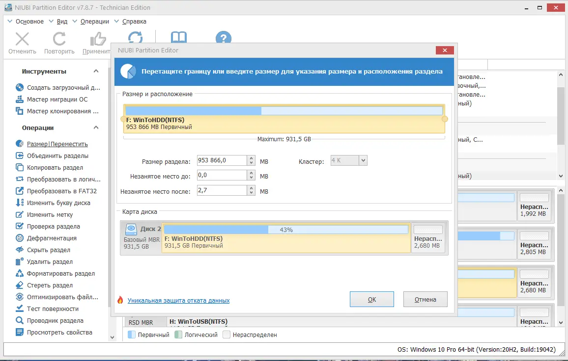 - Изменение размера и перемещение разделов без потери данных