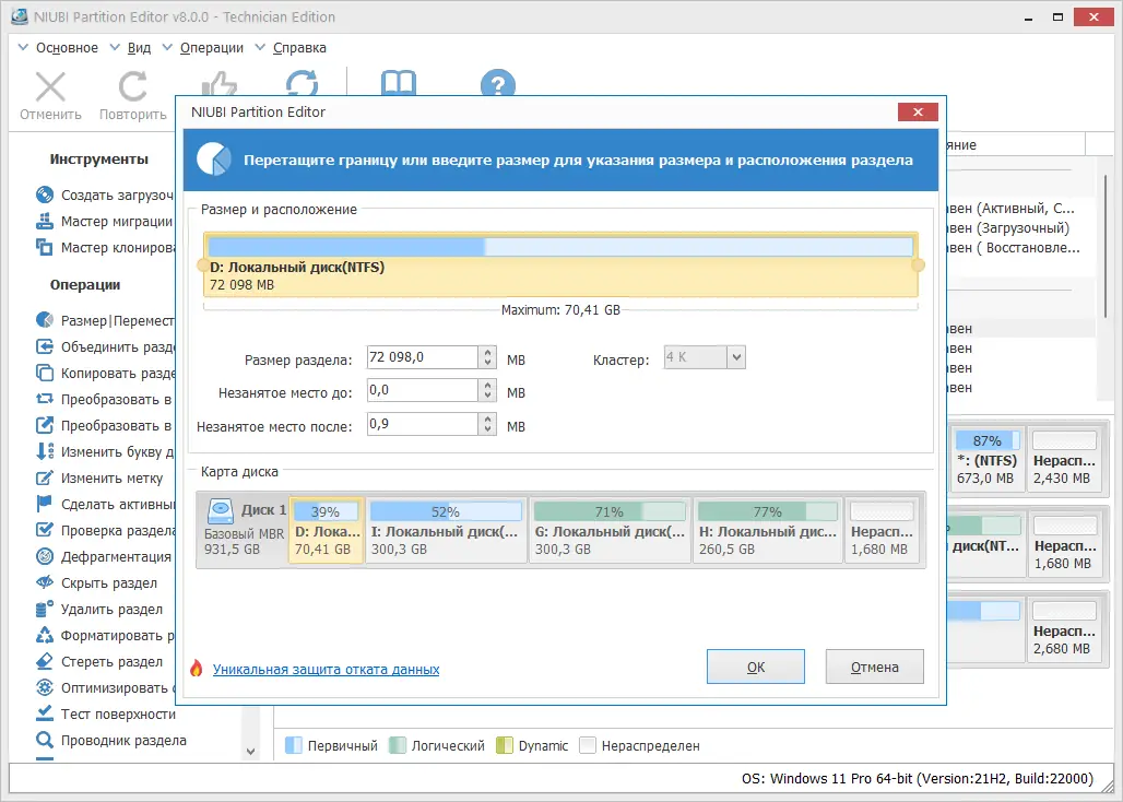 NIUBI Partition Editor — это инструмент для комплексного управления жёсткими дисками и другими накопителями. Он поддерживает широкий спектр операций, включая создание, удаление, форматирование и изменение размеров разделов, а также конвертацию между логическими и основными томами. Программа совместима с различными типами дисков, включая физические, виртуальные и RAID-массивы, что делает её универсальной для разных сценариев использования. Одним из ключевых преимуществ является возможность расширять разделы NTFS без перезагрузки системы, что особенно удобно в рабочих средах.