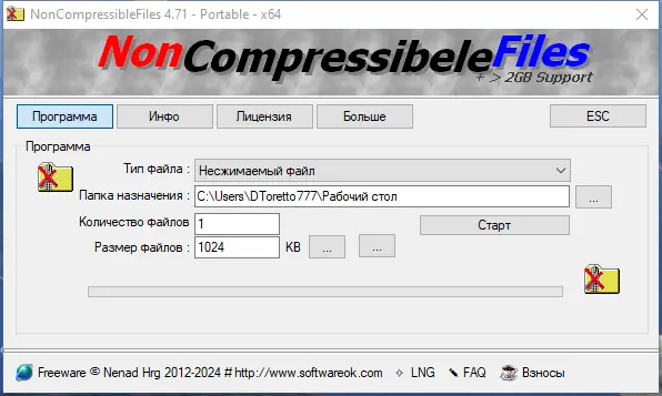 NonCompressibleFiles представляет собой специализированную системную утилиту, ориентированную на техническое тестирование. Она создаёт файлы с контролируемыми свойствами сжатия, что особенно полезно при оценке работы утилит резервного копирования, архиваторов и систем дедупликации. Пользователь может задавать количество файлов, их суммарный или индивидуальный объём — от нескольких килобайт до гигабайт, выбирая между максимально сжимаемыми и полностью несжимаемыми данными.