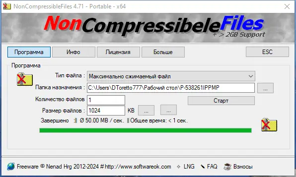 NonCompressibleFiles — это компактная утилита для создания файлов с заданным размером и уровнем сжимаемости, предназначенная для тестирования производительности архиваторов и систем хранения данных. Программа не требует установки и работает на всех актуальных версиях Windows. Она позволяет генерировать как полностью несжимаемые, так и легко сжимаемые файлы, что делает её полезным инструментом при анализе эффективности алгоритмов сжатия.