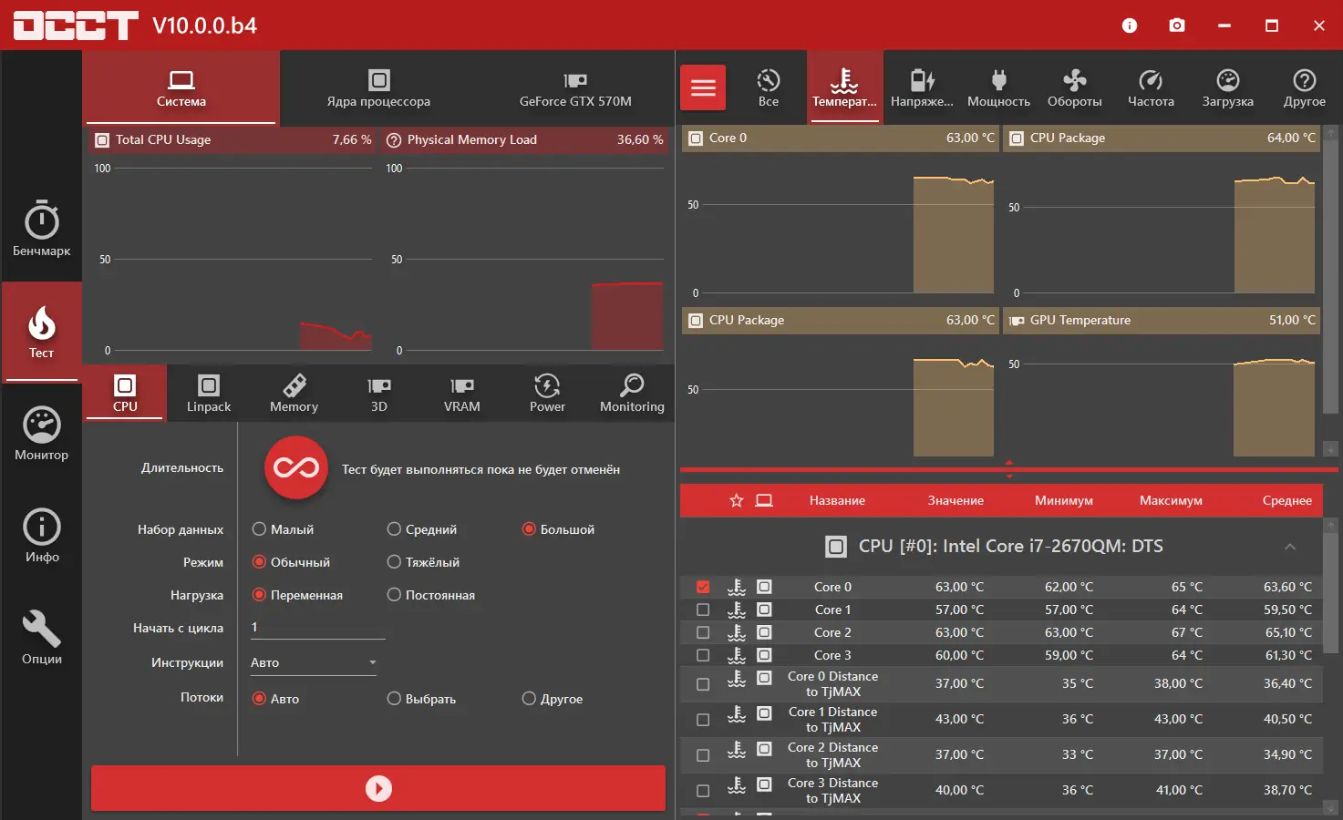 OCCT — это инструмент для тестирования стабильности компьютерной системы, позволяющий выявить проблемы с процессором, оперативной памятью и видеокартой под высокой нагрузкой. Программа строит подробные графики производительности и температурных показателей, что делает её незаменимой при разгоне или диагностике оборудования. Тест проводится в нескольких режимах, включая комплексную проверку CPU и RAM, а также отдельные сценарии нагрузки.
