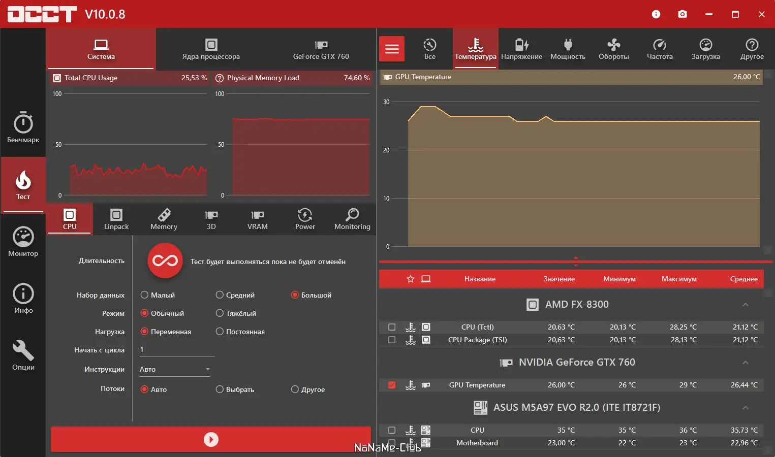 OCCT — это мощная утилита для проведения стресс-тестов, позволяющая проверить стабильность работы центрального процессора, оперативной памяти и видеокарты под высокой нагрузкой. Программа предоставляет детализированные графики производительности, температурные показатели и анализирует систему на наличие сбоев. Подходит для оверклокеров и пользователей, желающих протестировать надежность своего компьютера перед интенсивным использованием.