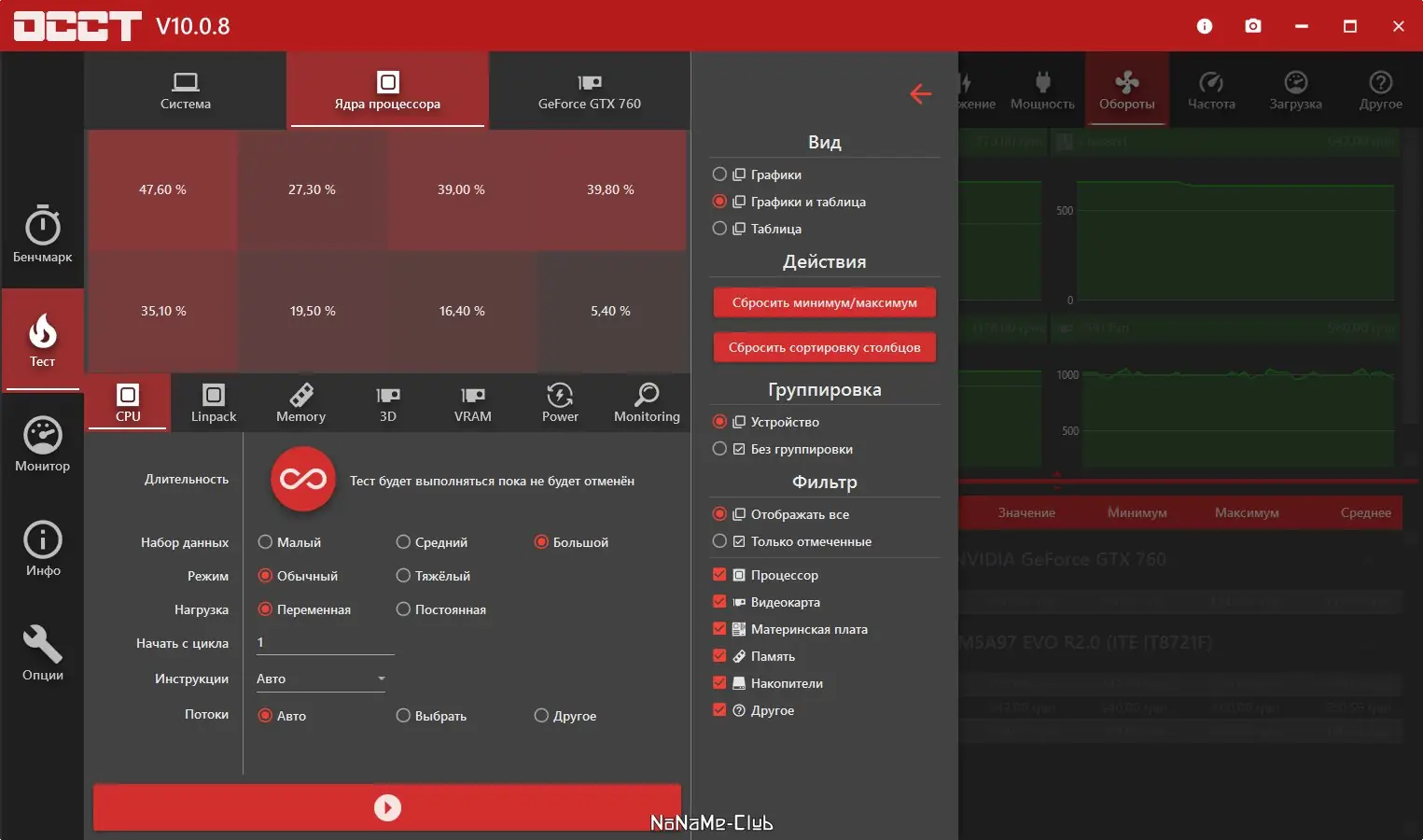 Запуск OCCT не требует сложной настройки. После открытия приложения пользователь выбирает тип теста: процессор, память или GPU. Для видеокарты доступен стресс-тест с настраиваемым шейдерным кодом, а также проверка видеопамяти через CUDA. Перед началом теста рекомендуется настроить длительность испытания и пороговые значения температуры. Во время выполнения нагрузки в реальном времени отображаются показатели напряжения, температуры и возможные ошибки, что позволяет оперативно реагировать на отклонения.