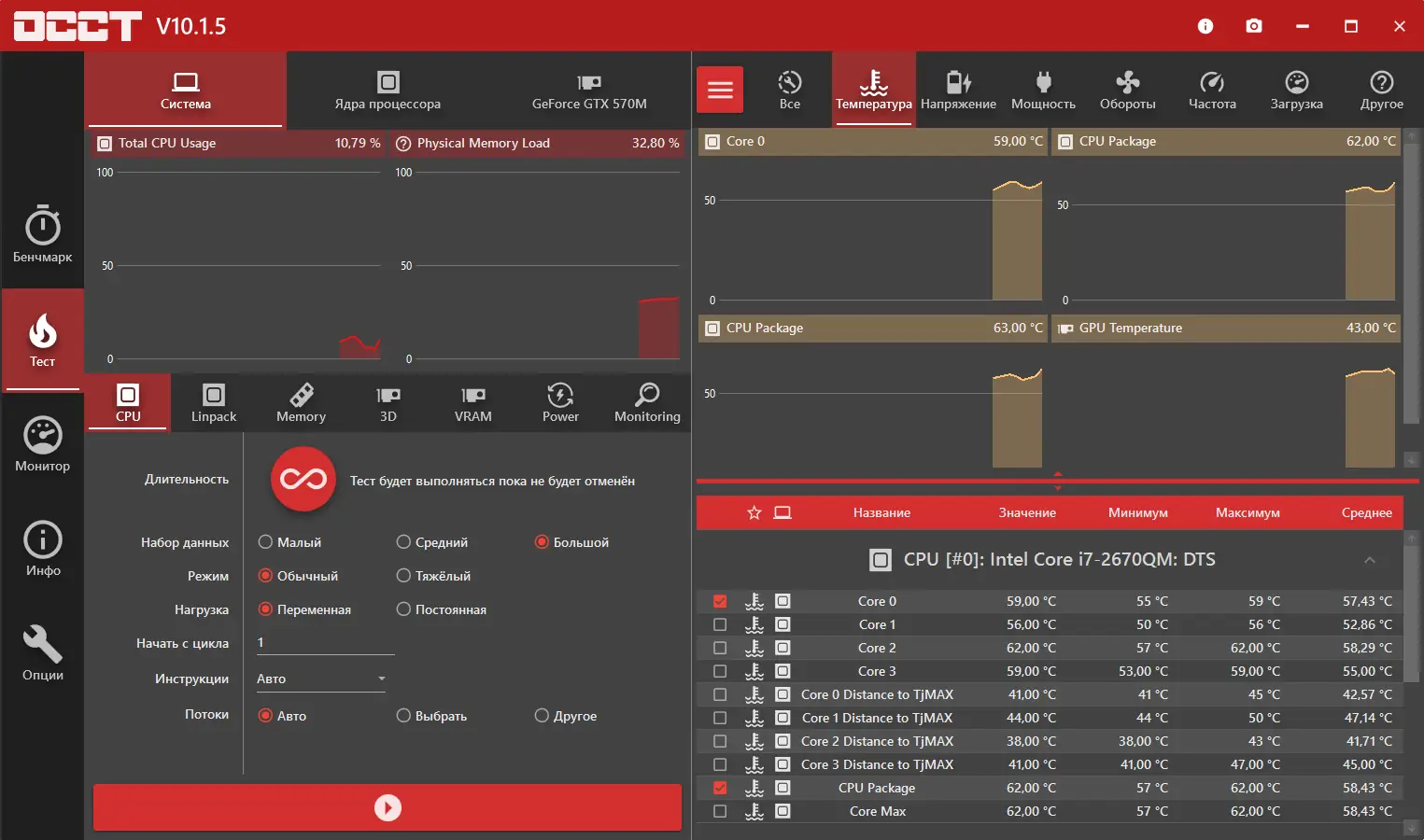 OCCT Perestroika — специализированное программное обеспечение, предназначенное для синтетического тестирования ключевых компонентов персонального компьютера. Утилита поддерживает параллельное тестирование процессора и оперативной памяти, а также позволяет проводить независимые проверки каждого из этих модулей. Это обеспечивает точную диагностику возможных нестабильностей, особенно после разгона или замены комплектующих. Результаты каждого теста отображаются в виде наглядных графиков, что упрощает анализ поведения системы под нагрузкой.