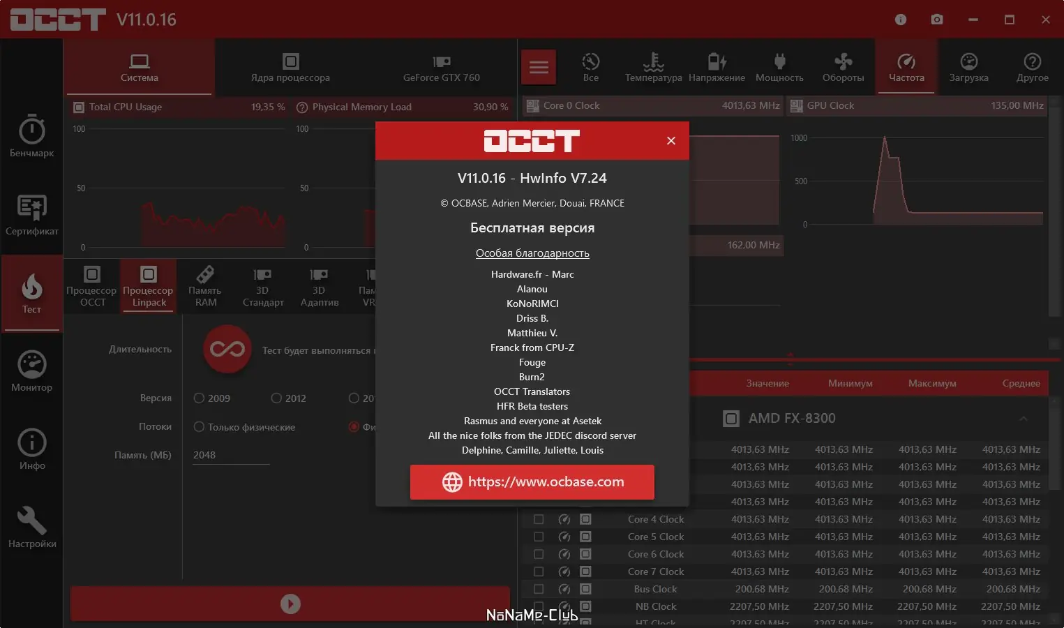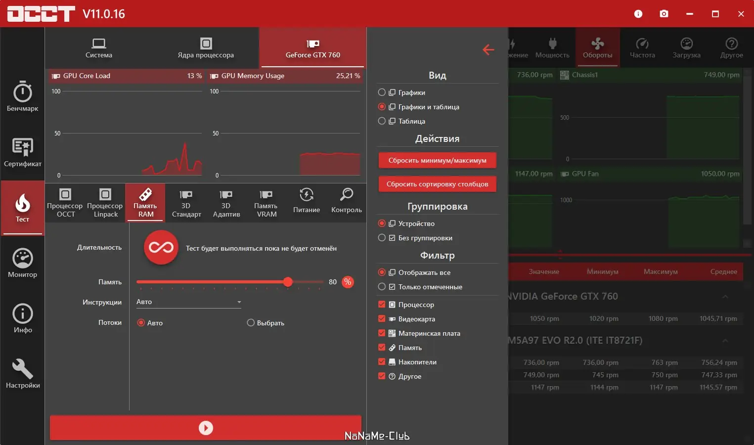 OCCT — утилита для комплексного тестирования стабильности системы, включающая нагрузочные тесты процессора, оперативной памяти и видеокарты с визуализацией результатов и мониторингом температурных показателей.
