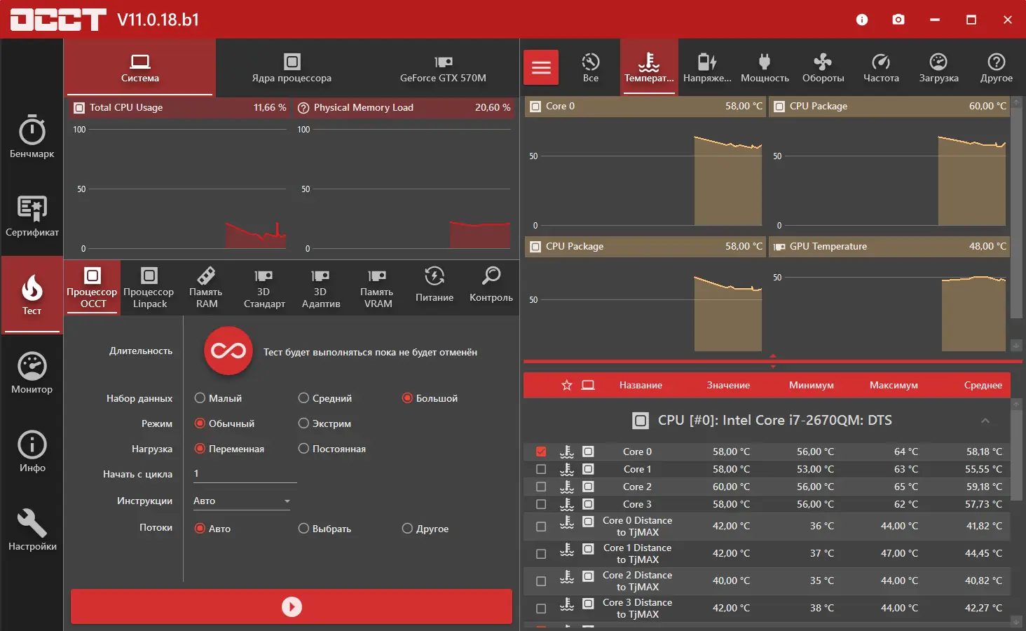 OCCT — это специализированное программное обеспечение, предназначенное для проведения синтетических тестов на стабильность работы компьютерной системы. Утилита способна выполнять параллельную нагрузку на процессор и оперативную память, а также проводить отдельные проверки каждого компонента. Результаты теста отображаются в виде детализированных графиков, позволяя отслеживать изменения напряжения, температуру и производительность в реальном времени.