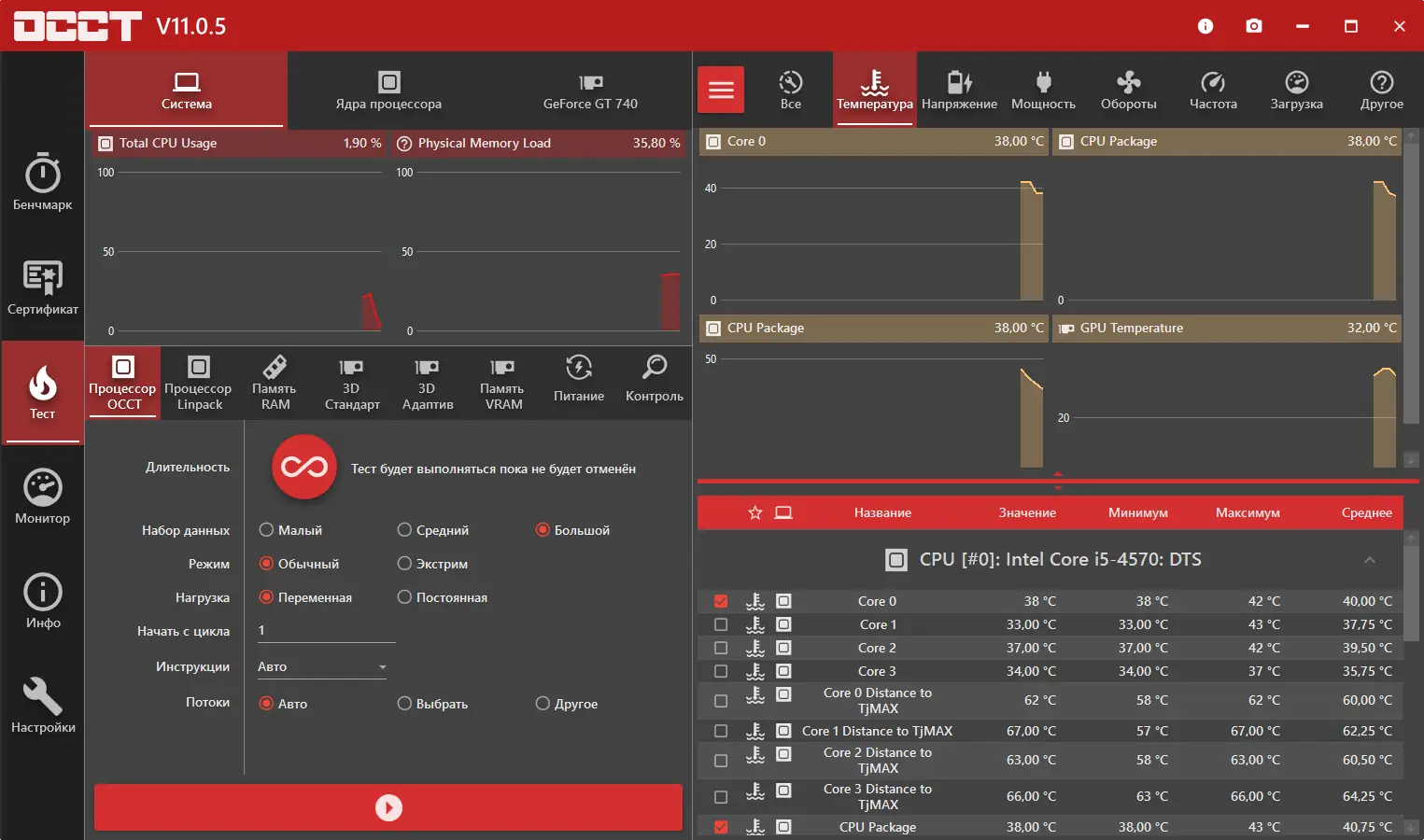 OCCT Perestroika предназначена для синтетического тестирования ключевых компонентов компьютера, обеспечивая высокую точность и детализацию результатов. Утилита позволяет проводить параллельное тестирование процессора и оперативной памяти, а также отдельные проверки каждого из этих компонентов. В процессе выполнения теста система отслеживает напряжение, температуру и производительность, интегрируясь с такими мониторинговыми инструментами, как SpeedFan и AIDA64.