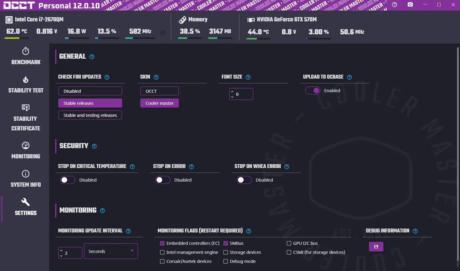Использование OCCT не требует глубоких технических знаний. После запуска программы пользователь выбирает тип теста — процессор, память или видеокарта. Далее настраивается продолжительность проверки, уровень нагрузки и параметры мониторинга. Программа позволяет проводить как краткосрочные, так и длительные испытания, включая автоматическое завершение при достижении критических значений температуры или обнаружении ошибок. Интерфейс интуитивно понятен, а наличие двух тем оформления — стандартной и Coolermaster — делает работу с утилитой более комфортной. Для автоматизации тестов доступна командная строка, особенно полезная в корпоративной среде.