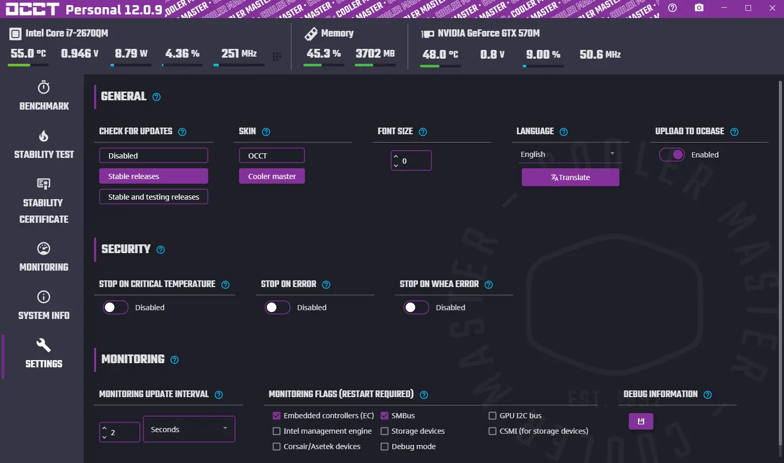 - Две темы оформления интерфейса — стандартная и Coolermaster.