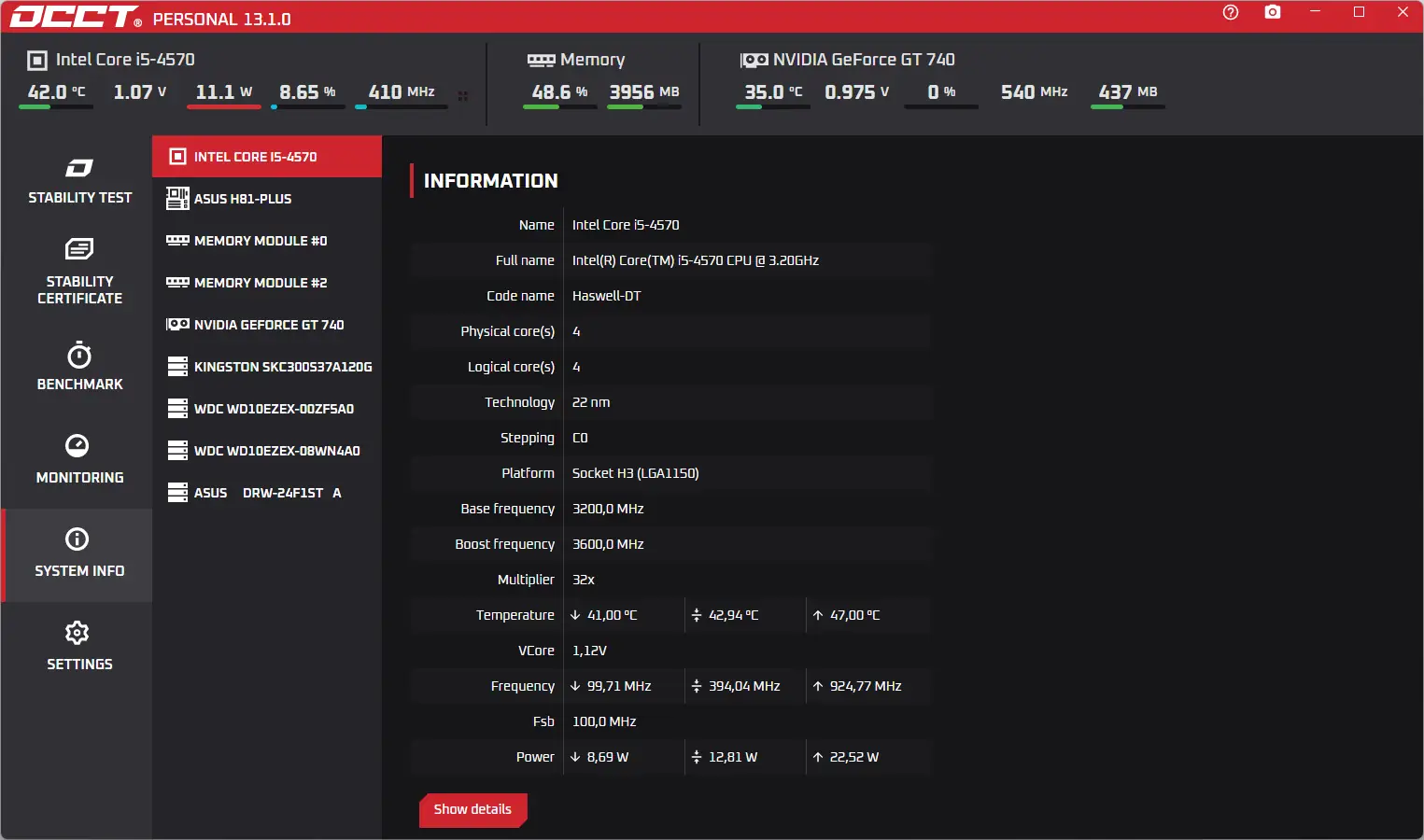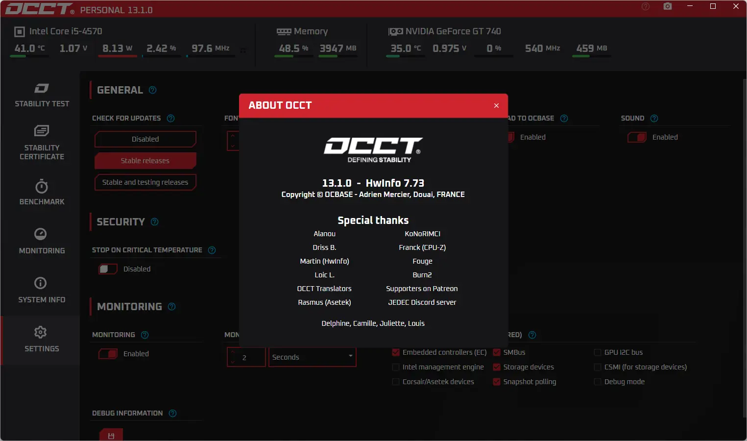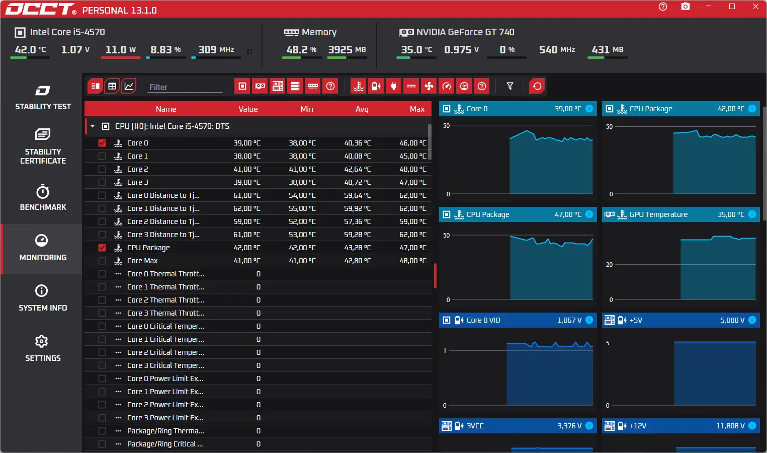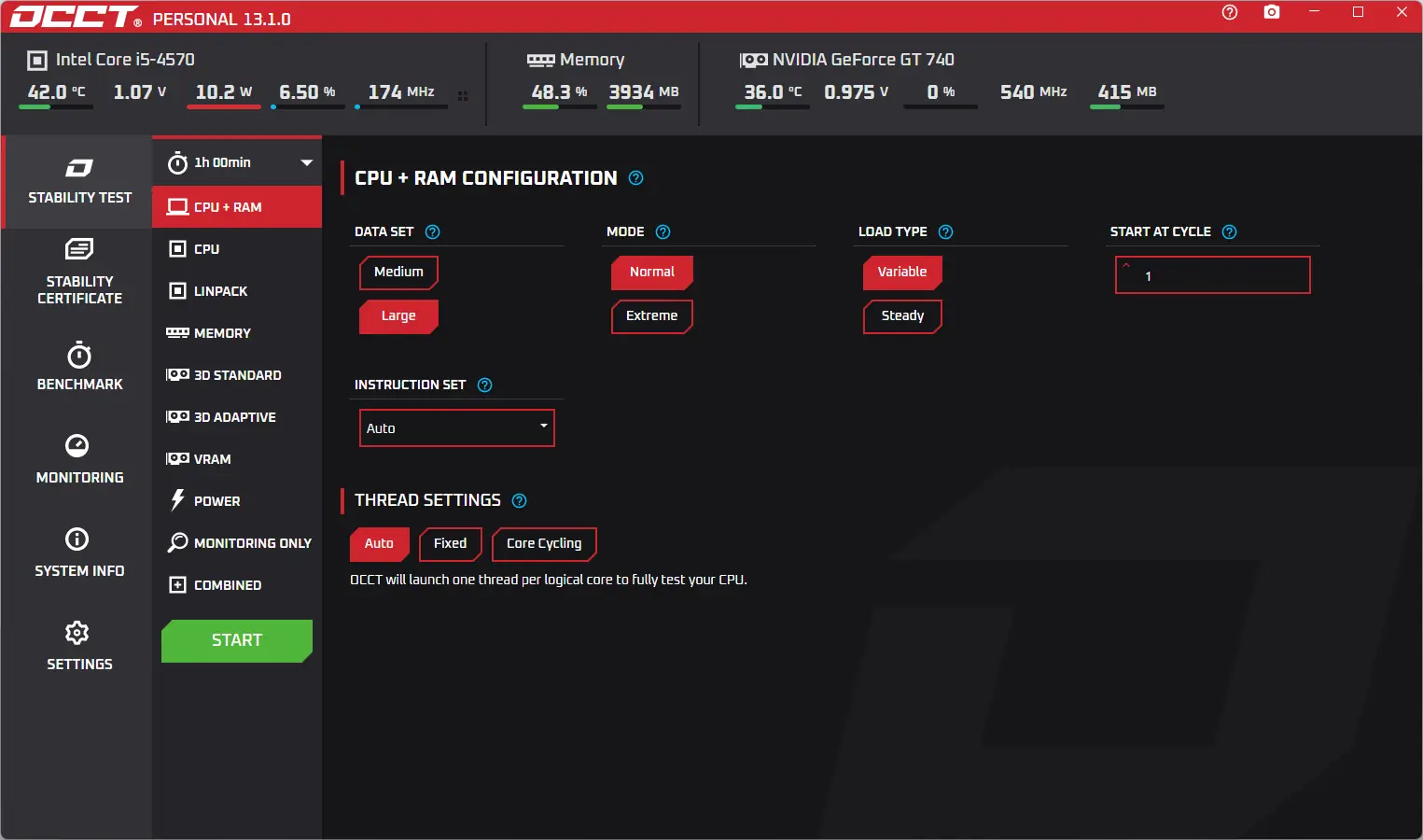 OCCT — мощная утилита для тестирования стабильности компьютерной системы, оценки производительности и выявления возможных сбоев в работе аппаратных компонентов. Программа проводит стресс-тесты центрального процессора, оперативной памяти и видеокарты, отслеживая температуру, напряжение и нагрузку в реальном времени. Результаты отображаются в виде наглядных графиков, что позволяет быстро проанализировать состояние системы.