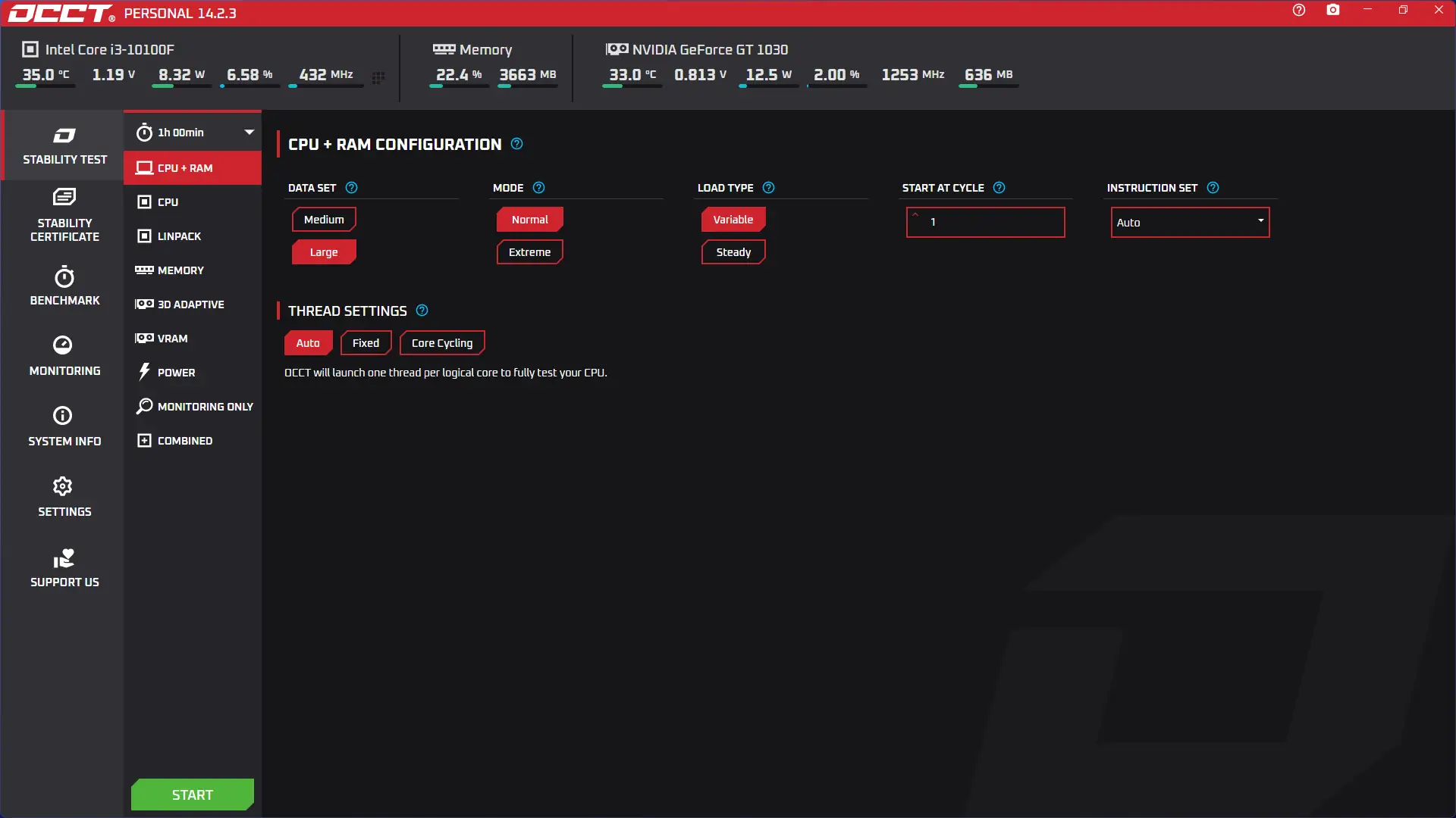 Программа OCCT предназначена для всестороннего тестирования стабильности аппаратных компонентов персонального компьютера. Основной акцент сделан на проверке центрального процессора и оперативной памяти в парном режиме, а также на отдельной оценке производительности каждого из них. В ходе теста система собирает данные о температуре, частоте, напряжении и возможных ошибках, что позволяет выявить слабые места в конфигурации.
