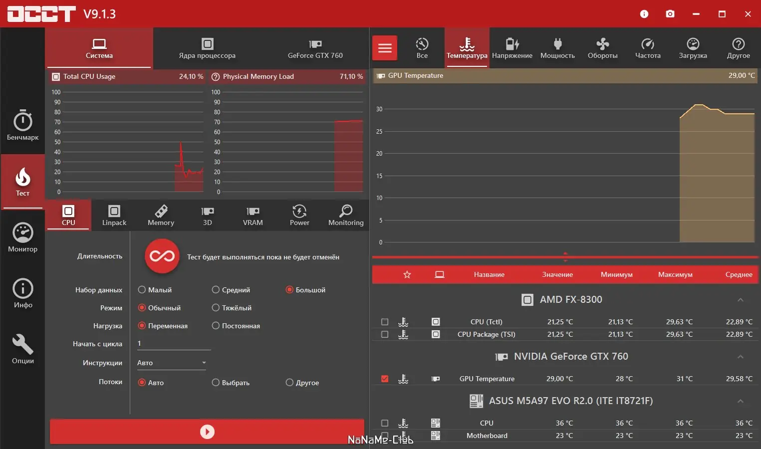 Использование OCCT не требует глубоких технических знаний. После запуска программы пользователь выбирает тип теста: CPU, GPU или совмещённый режим. Далее настраиваются параметры нагрузки, длительность испытания и уровень мониторинга. Во время выполнения теста отображаются актуальные данные по температуре, напряжению и частоте, а по завершении формируется график с отклонениями и ошибками.
