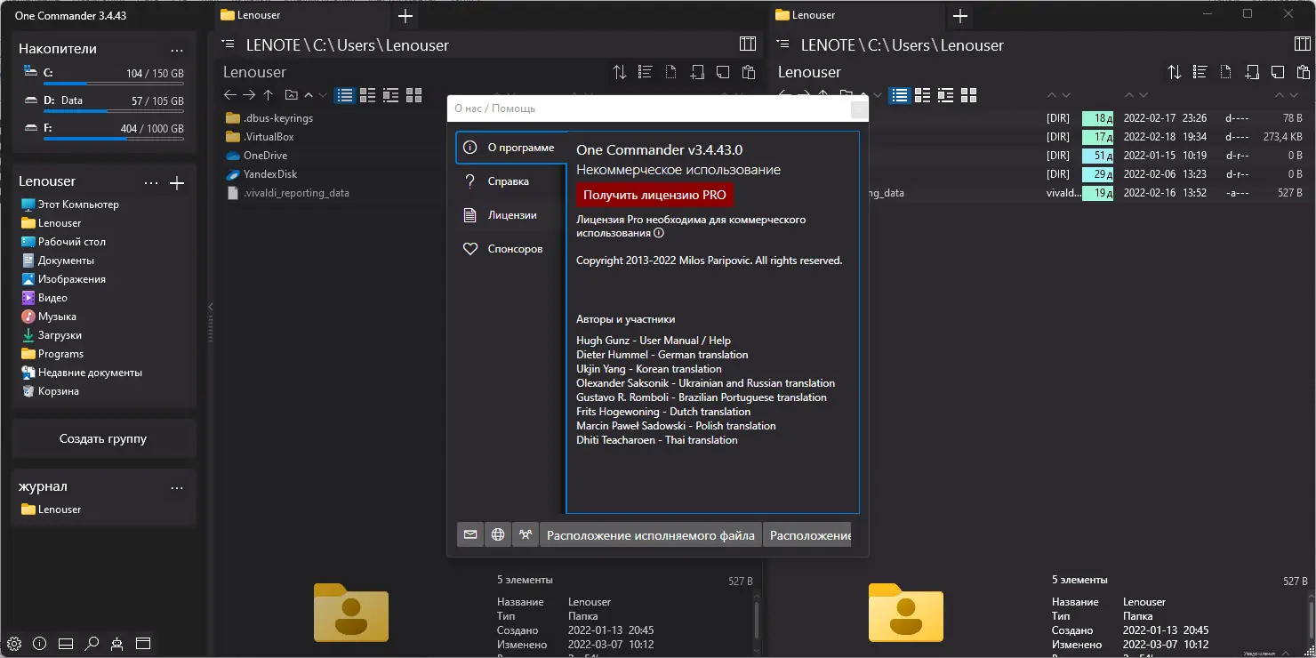 One Commander предлагает современный подход к управлению файловой системой, заменяя стандартный проводник Windows на более функциональный и визуально продуманный инструмент. Интерфейс построен на двух панелях, расположенных рядом, что позволяет быстро перемещать и копировать данные между каталогами без необходимости открывать несколько окон. Каждая панель автоматически подстраивается под длину названий папок и файлов, а длинные имена сокращаются с помощью многоточия для лучшей читаемости.