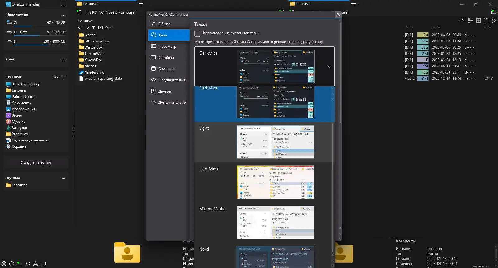 - Поддержка тем оформления и цветовых меток для быстрой визуальной идентификации файлов