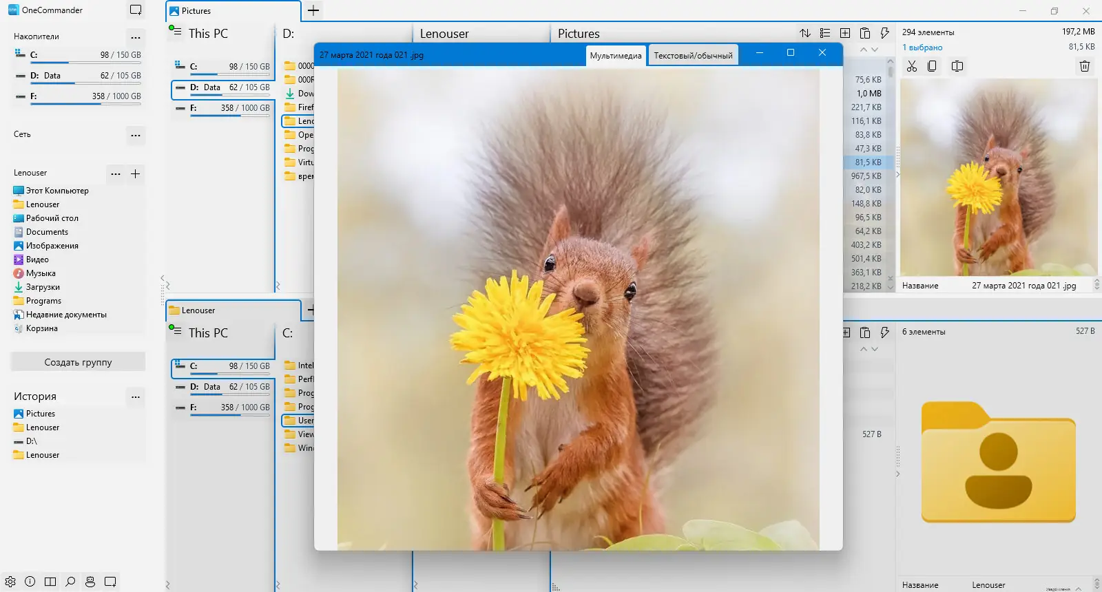 - Встроенный просмотр изображений, текстовых файлов и документов
