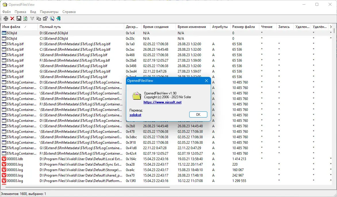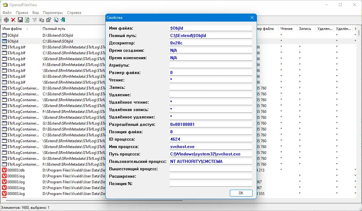OpenedFilesView — это компактная системная утилита, позволяющая просматривать список всех файлов, открытых в текущий момент операционной системой. Программа отображает детальную информацию о каждом активном файле, включая процесс, который его использует, права доступа и дескриптор. Это делает её незаменимым инструментом при решении проблем с блокировкой файлов.
