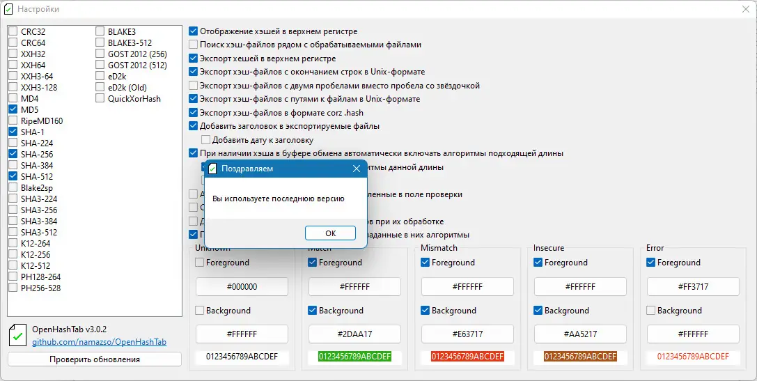 - Поддерживает 28 алгоритмов хеширования, включая MD5, SHA-256, BLAKE3 и Streebog, что делает её универсальным инструментом для различных сценариев проверки.