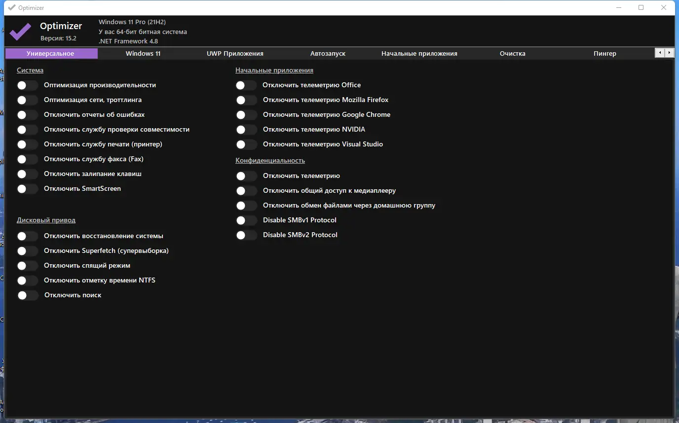 Optimizer — это мощная системная утилита для расширенной настройки операционной системы, ориентированная на повышение безопасности, конфиденциальности и производительности. Программа позволяет глубоко оптимизировать параметры Windows, отключая телеметрию, ненужные службы и фоновые процессы, мешающие стабильной работе. Подходит для использования после чистой установки ОС, обеспечивая тонкую настройку под индивидуальные требования пользователя.