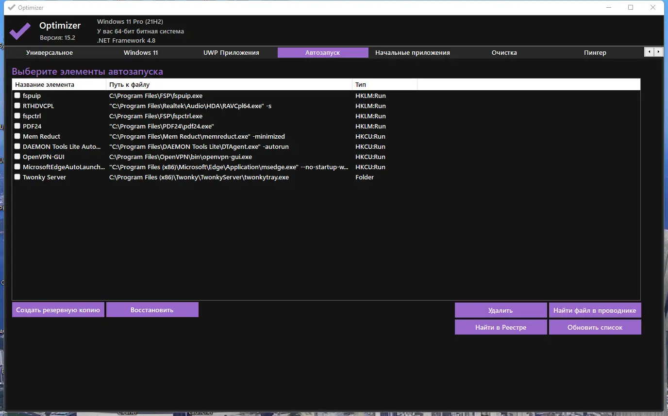 - Отсутствие встроенного резервного копирования перед внесением изменений в реестр или системные службы.