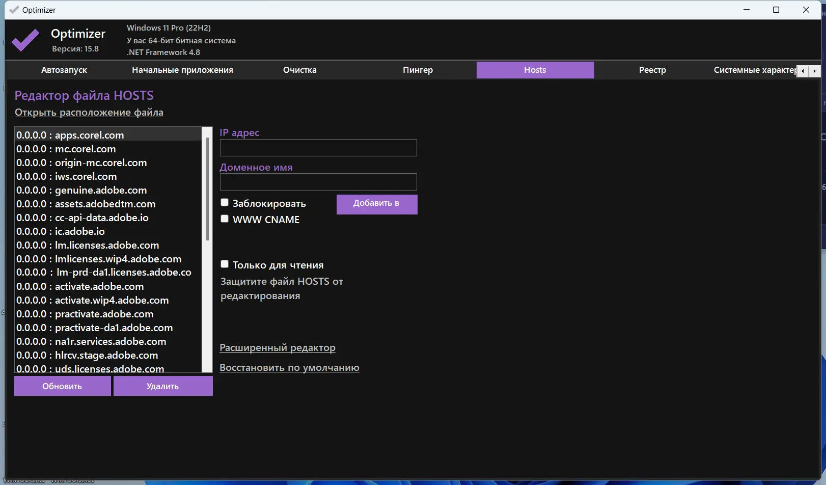 Использование Optimizer не требует глубоких технических знаний, но предполагает внимательный подход к выбору настроек. После запуска приложение отображает категории функций, сгруппированные по назначению: безопасность, производительность, сеть, реестр и автозагрузка. Пользователь активирует нужные параметры, после чего применяет изменения и перезагружает компьютер для их активации. Для продвинутых сценариев доступны команды запуска, такие как /restart=disabledefender, позволяющие отключить Защитник Windows через безопасный режим без ручного вмешательства. Также можно редактировать файл hosts, находить процессы, блокирующие файлы, и тестировать сетевую задержку с помощью встроенного пингера с поддержкой пользовательских DNS и шаблонов.