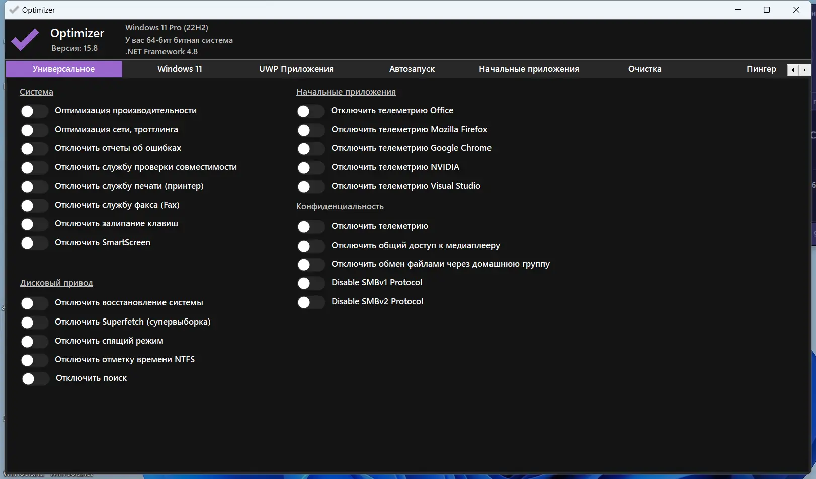 Optimizer — это мощная системная утилита для тонкой настройки операционной системы Windows, ориентированная на повышение безопасности, конфиденциальности и производительности. Программа позволяет отключать телеметрию, управлять автозагрузкой, настраивать сеть и реестр, а также оптимизировать работу системы после чистой установки. Поддержка множества языков и гибкие настройки делают её универсальным инструментом для пользователей, заботящихся о контроле над своим ПК.
