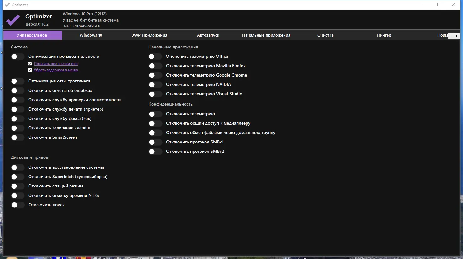 Optimizer — это мощная системная утилита для тонкой настройки операционной системы Windows, ориентированная на повышение уровня безопасности и конфиденциальности. Программа позволяет глубоко оптимизировать систему, отключая телеметрию, удаляя ненужные компоненты и настраивая параметры производительности. Особенно эффективна после чистой установки Windows, когда требуется быстрая и безопасная настройка.
