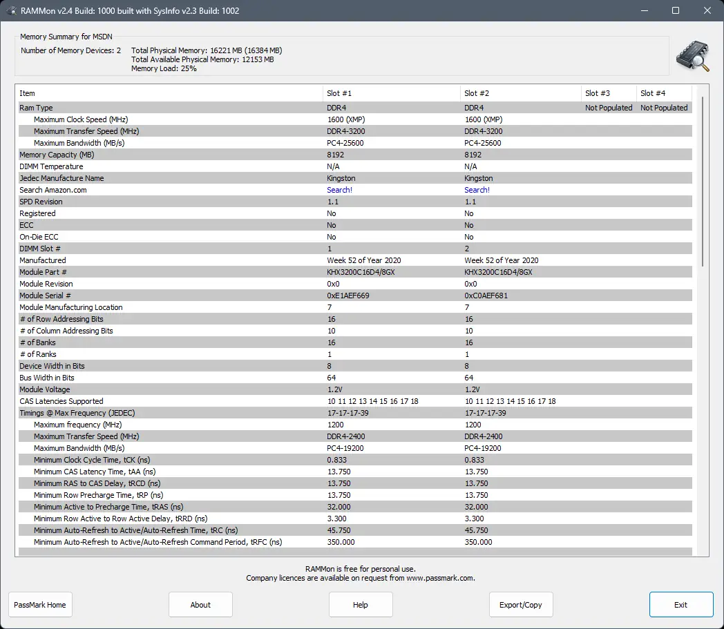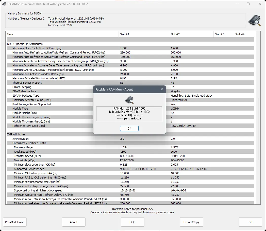PassMark RAMMon — это специализированная утилита для диагностики и анализа оперативной памяти, позволяющая получить детальную информацию о модулях RAM, установленных в системе. Программа считывает данные SPD и отображает их в удобочитаемом формате, включая технические параметры, такие как частота, тайминги, напряжение и производитель. Инструмент поддерживает все современные типы памяти, включая DDR2, DDR3, DDR4, DDR5, а также технологии XMP и EPP.