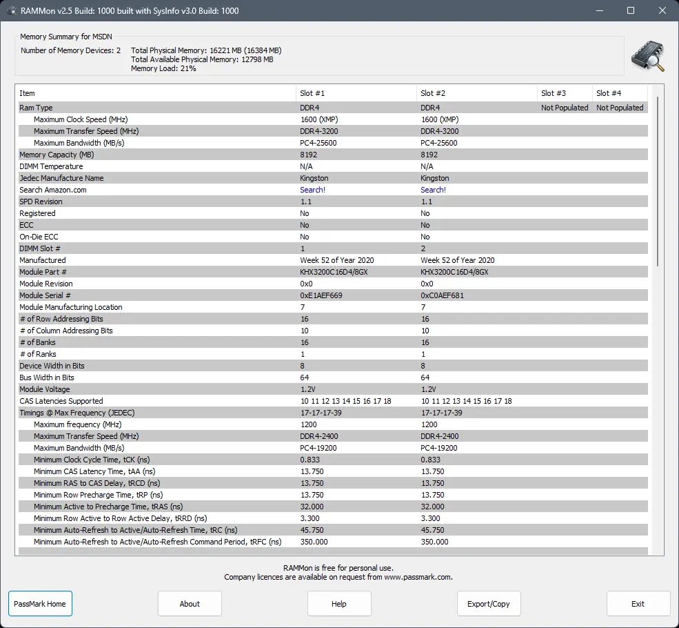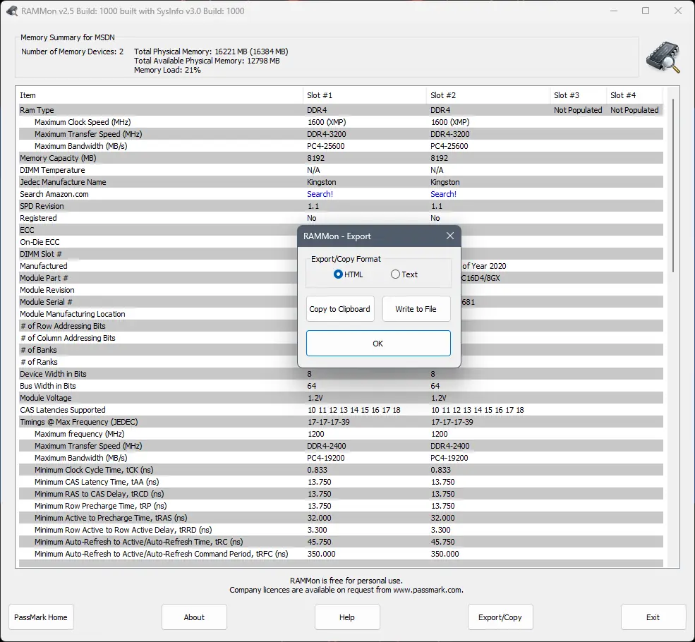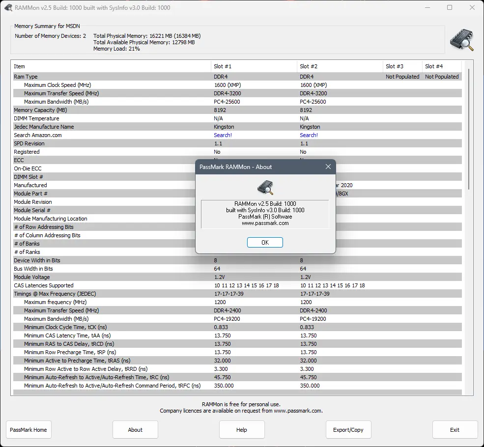 PassMark RAMMon — это компактная утилита для анализа и отображения информации о модулях оперативной памяти с помощью данных SPD. Программа позволяет получить детальные сведения о типе памяти, производителе, технических параметрах и текущем состоянии модулей. Поддерживает широкий спектр типов ОЗУ, включая современные DDR4 и DDR5.